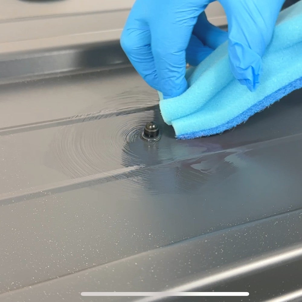 Vóór het verlijmen moet de hechtingsversterker goed worden geschud en vervolgens met de meegeleverde spons worden aangebracht. Na korte tijd zou het voldoende moeten zijn verdampt, zodat er bij het nemen van een vingermonster slechts een klein residu op de vinger achterblijft. Nu kan de pleister worden aangebracht en stevig worden aangedrukt.